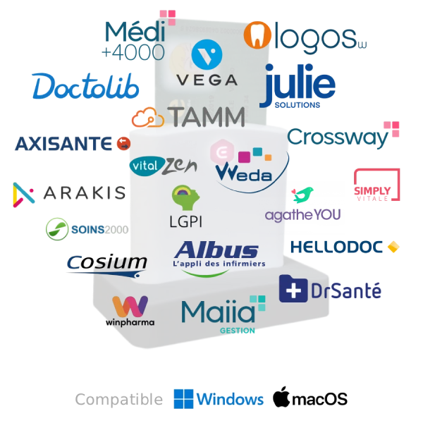 Il fonctionne parfaitement avec les logiciels agréés du marché, garantissant une intégration fluide dans tous les cabinets et établissements médicaux.