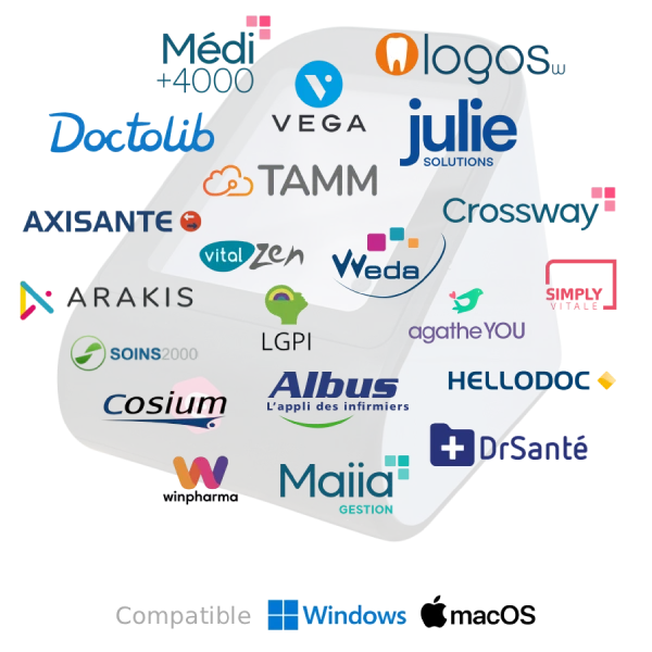 L’e-Lecteur Flash est compatible tout les logiciels dont Doctolib, VEGA, Agathe YOU, Agathe e.motion, Médi +4000, Soins 2000, Albus, Simply Vitale, Axisanté, Tamm, Julie, DrSanté, Logos, Weda, Hellodoc, Medistory, ExpressVitale, LGPI, CGM eVITALE, Cosium, Télévitale, Maiia Gestion, Winpharma, Xplore, Arakis, Crossway, VitalZen, etc.