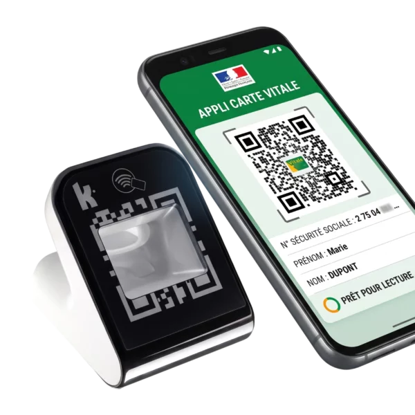 Le KAP-eCV permet la lecture directe des QR codes affichés dans l’application carte Vitale. Grâce à son module de scan 2D, il capture rapidement les informations contenues dans le code affiché sur le smartphone, sans manipulation complexe. La lecture est instantanée et fonctionne avec les formats CB2D utilisés par l’application.